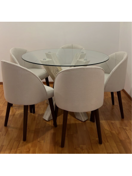 Estructura: Madera 100% tornillo. Tablero: Vidrio Relleno Interno silla: Panel de Espuma Zebra marca Paraíso  Grosor de espuma: 5 pulgadas Material de las Patas: Madera tornillo  Tiempo de producción y entrega: 6 días hábiles. Garantía 12 meses.