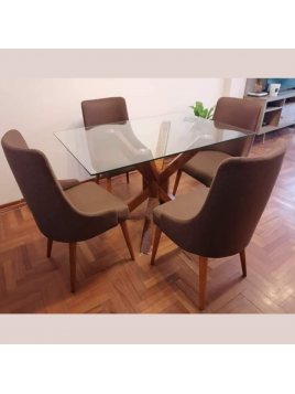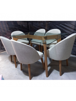 Estructura: Madera 100% tornillo. Tablero: Vidrio Relleno Interno silla: Panel de Espuma Zebra marca Paraíso  Grosor de espuma: 5 pulgadas Material de las Patas: Madera tornillo  Tiempo de producción y entrega: 6 días hábiles. Garantía 12 meses.
