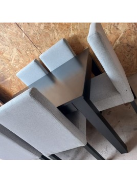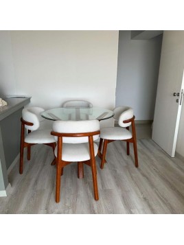 Estructura: Madera 100% tornillo. Tablero: vidrio Relleno Interno silla: Panel de Espuma Zebra marca Paraíso Grosor de espuma: 5 pulgadas Material de las Patas: Madera tornillo Tiempo de producción y entrega: 10 días hábiles. Garantía 12 meses.