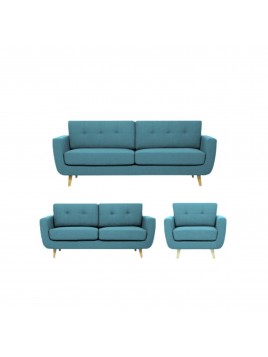Renueva tu sala con el elegante juego de sala Ginea 3+2+1 con 6 cojines decorativos en tela del mismo color del mueble, disponible con la marca LMUEBLE.