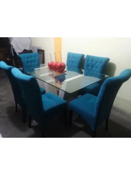 Estructura: Madera 100% tornillo. Tablero: Vidrio Relleno Interno silla: Panel de Espuma Zebra marca Paraíso Grosor de espuma: 5 pulgadas Material de las Patas: Madera tornillo Tiempo de producción y entrega: 6 días hábiles. Garantía 12 meses.