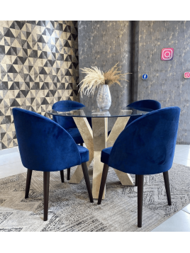 Estructura: Madera 100% tornillo. Tablero: Vidrio 10 mm Relleno Interno silla: Panel de Espuma Zebra marca Paraíso  Grosor de espuma: 5 pulgadas Material de las Patas: Madera tornillo  Tiempo de producción y entrega: 6 días hábiles. Garantía 12 meses.