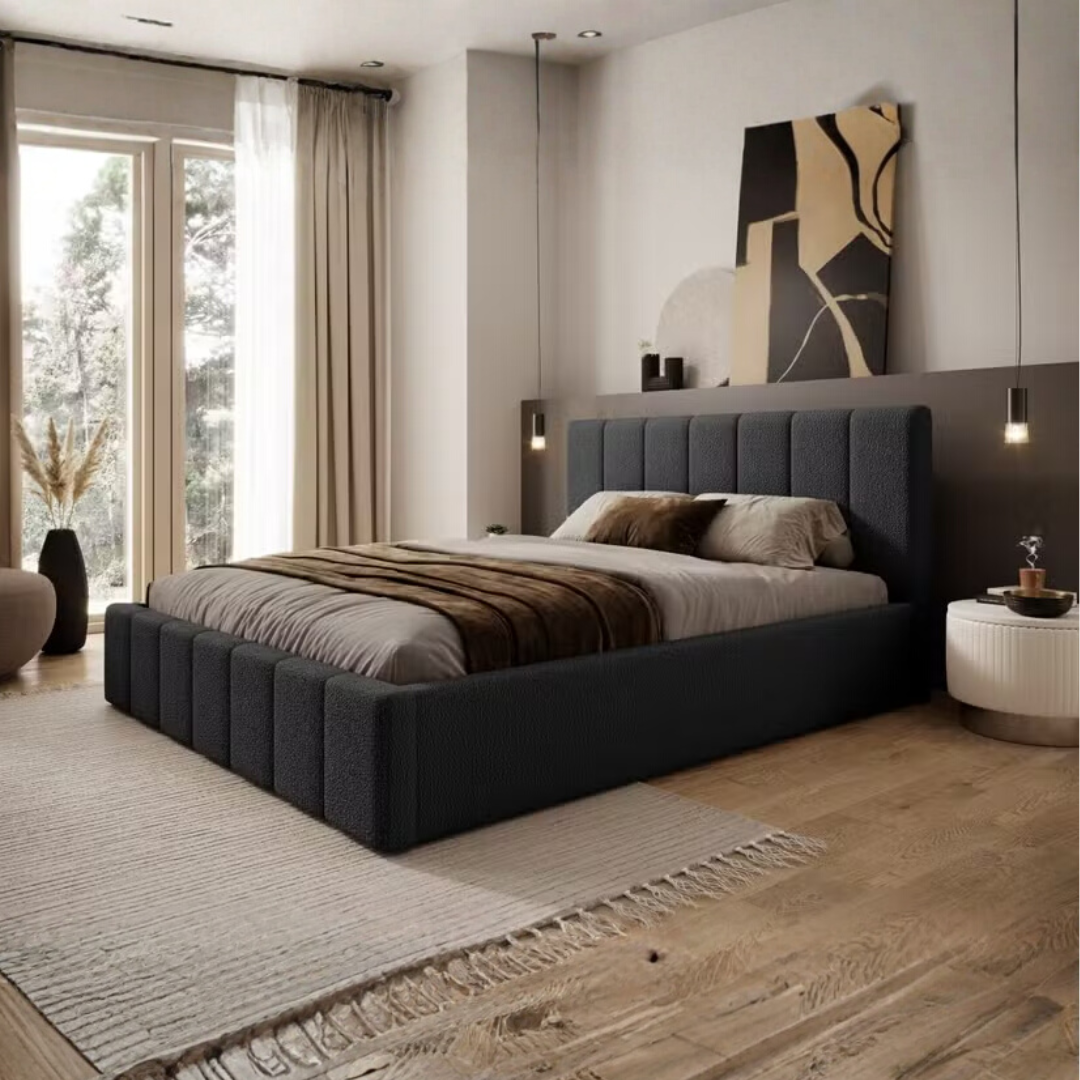 El diseño de cabecera elegante y base tarima robusta aportan carácter al dormitorio, convirtiendo la cama en el centro decorativo del ambiente.