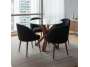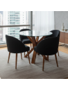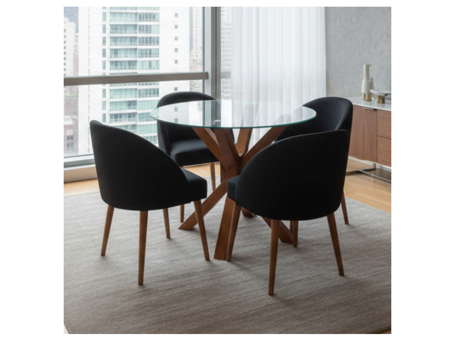 Acompañando al seccional, el combo integra un comedor redondo de 4 sillas con tablero de 100 cm de diámetro, fabricado íntegramente en madera tornillo seca al horno, reconocida por su durabilidad y resistencia. Cada silla está tapizada en la misma tela chenille antifluido, creando una armonía visual moderna y acogedora.