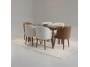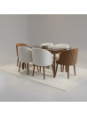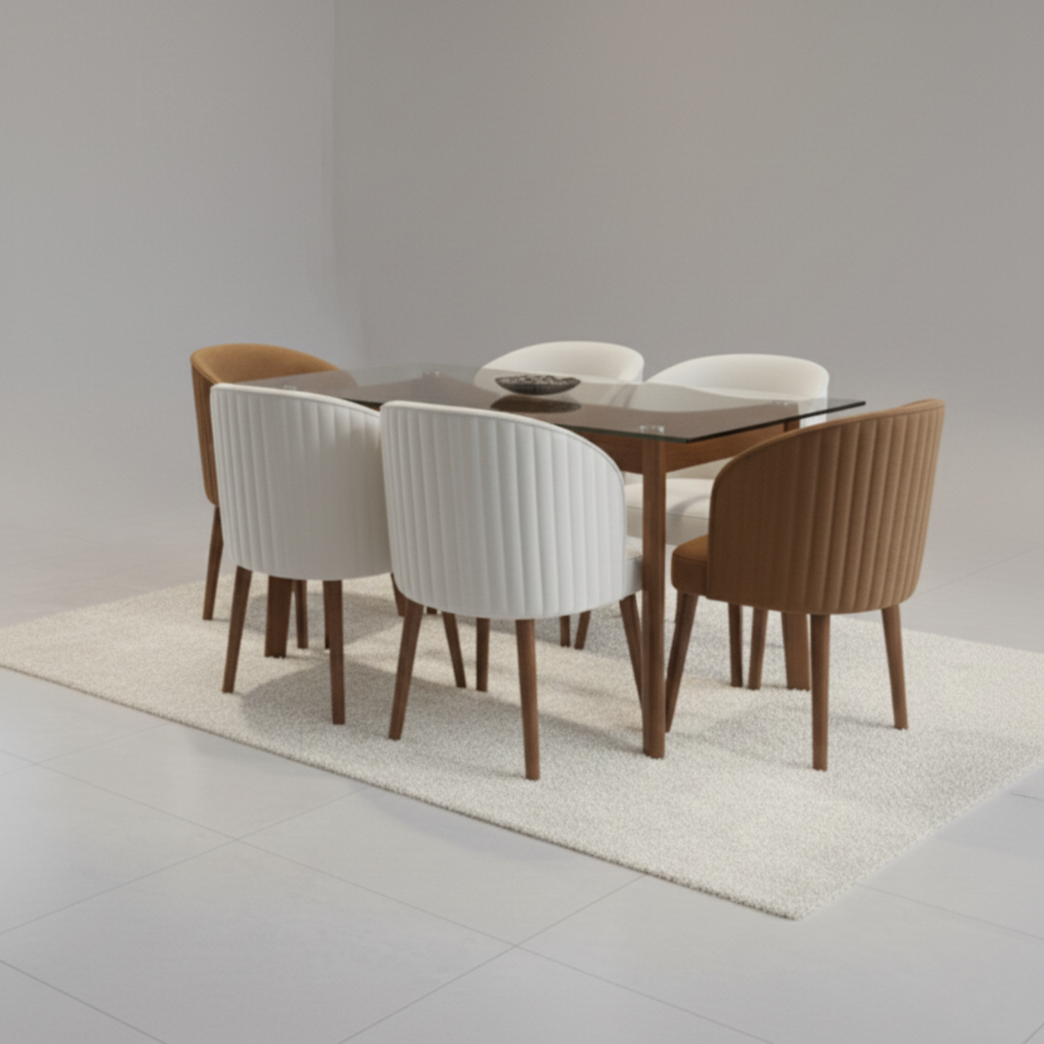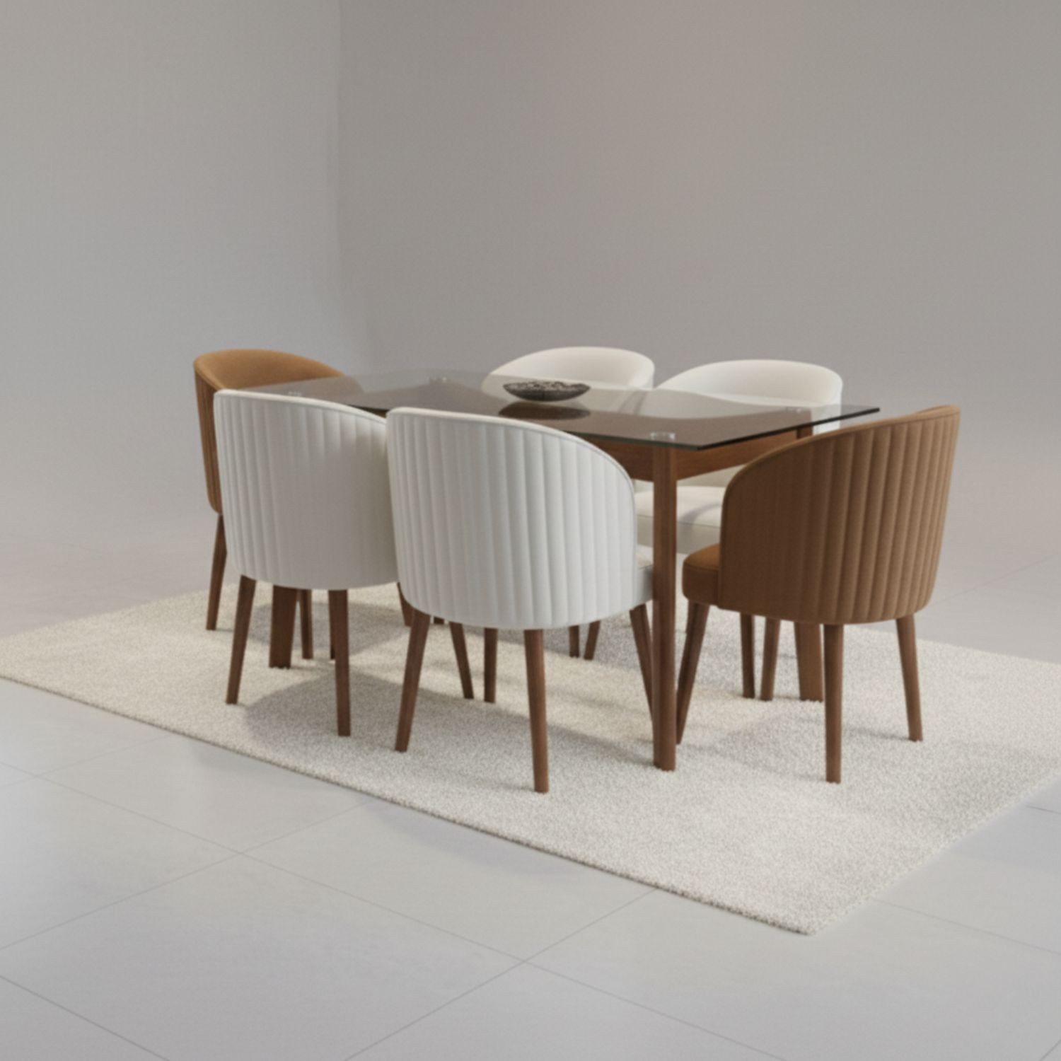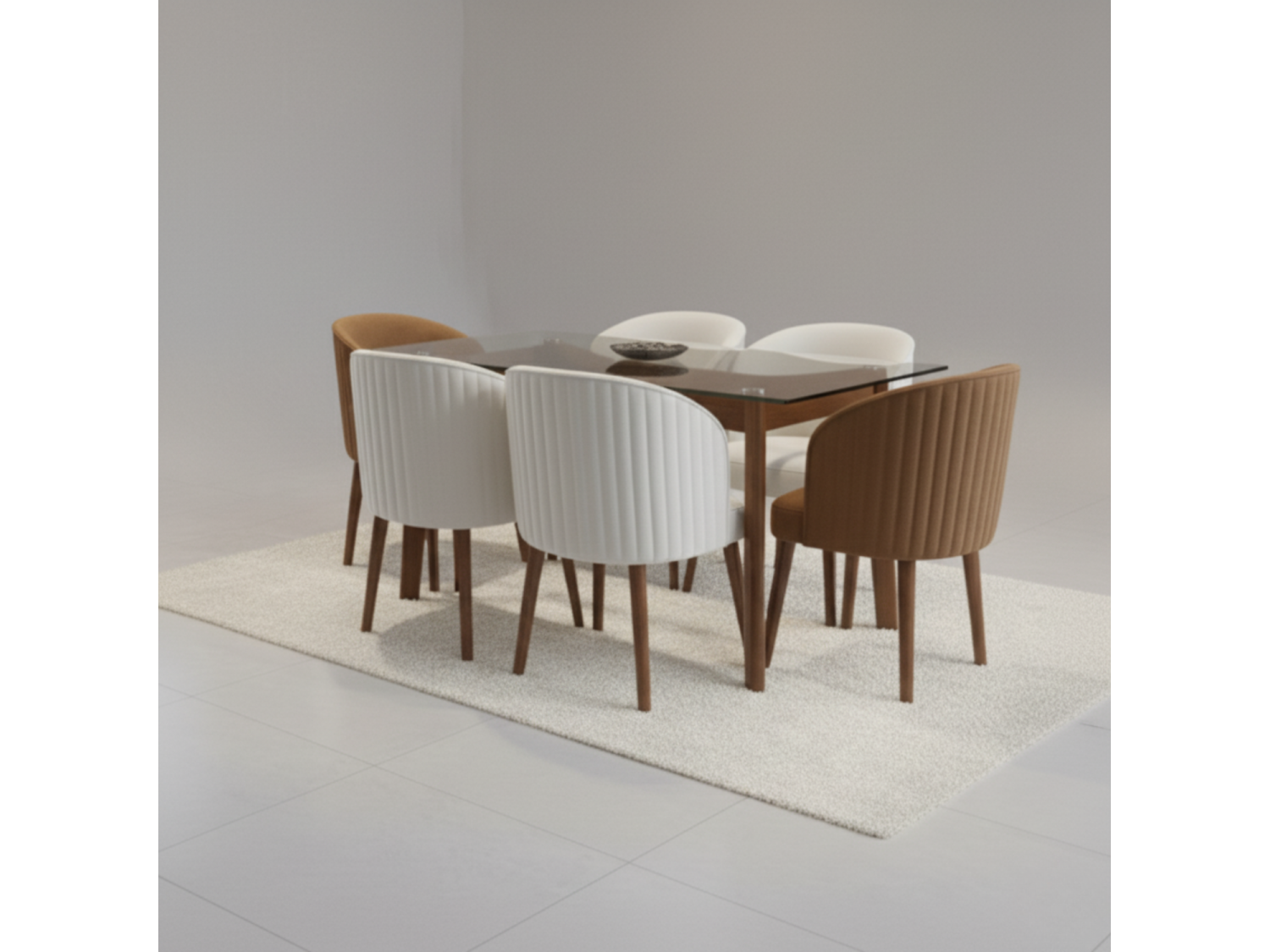 Complementando el conjunto, el comedor rectangular de 150 cm x 90 cm cuenta con un elegante tablero de vidrio templado de 10 mm de grosor y 6 sillas tapizadas en tela antifluido, manteniendo la armonía estética y la resistencia que caracteriza a LMUEBLE.