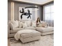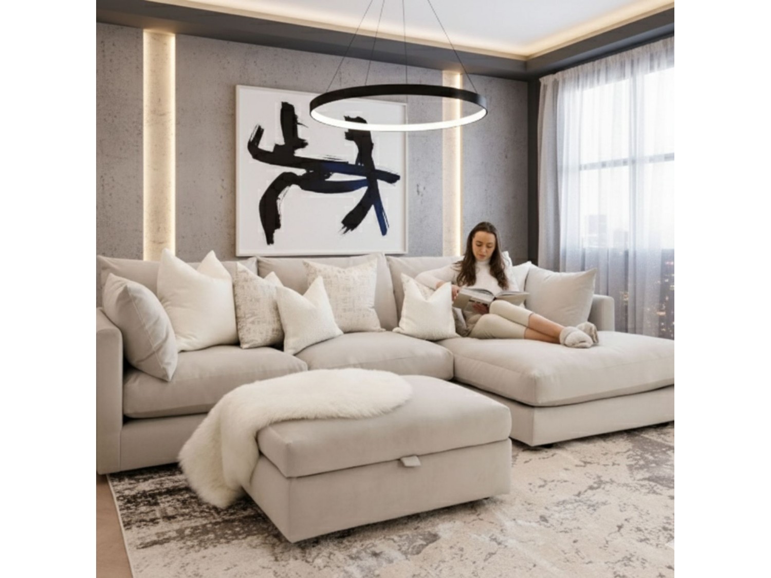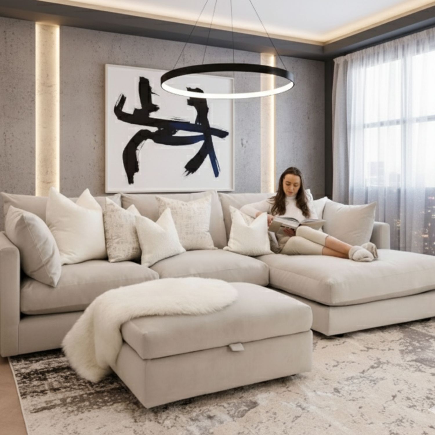 Composición: Seccional moderno + Banqueta baúl + Comedor rectangular de 6 sillas