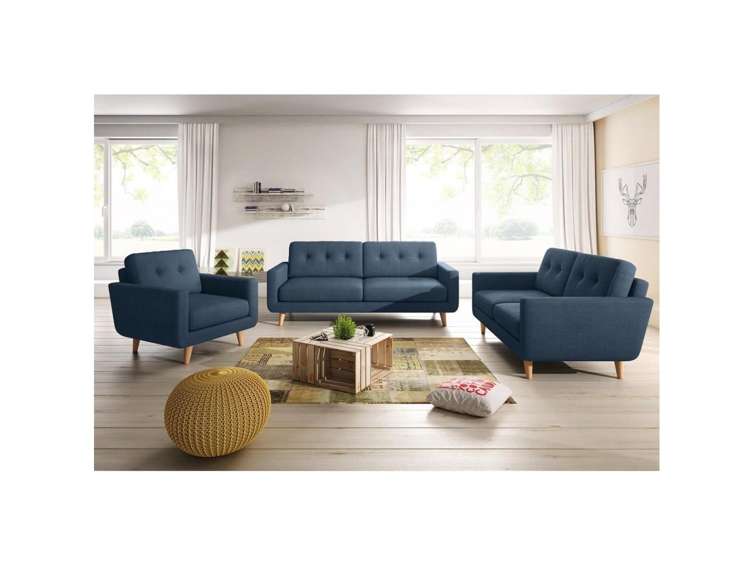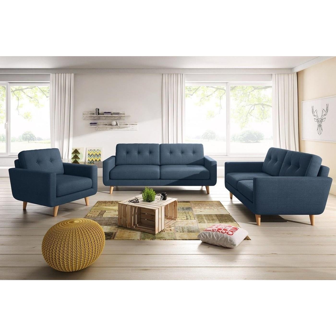 Juego de sala Spider Azul 3+2+1 con 6 cojines en tela Microfibra