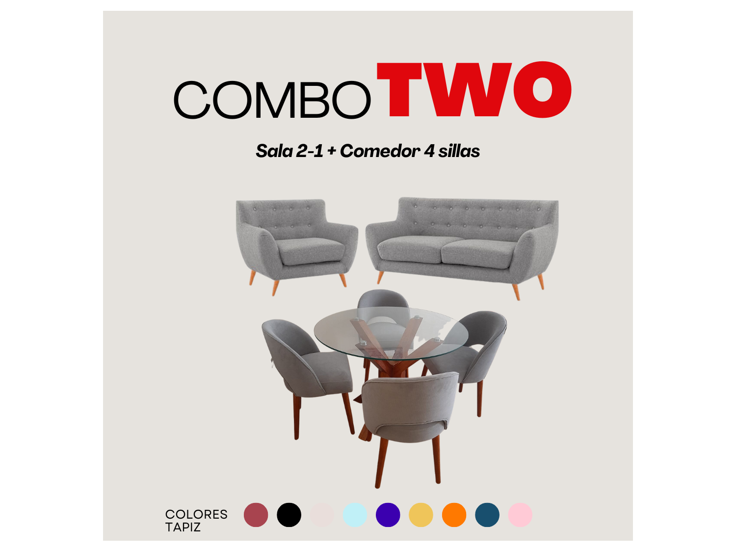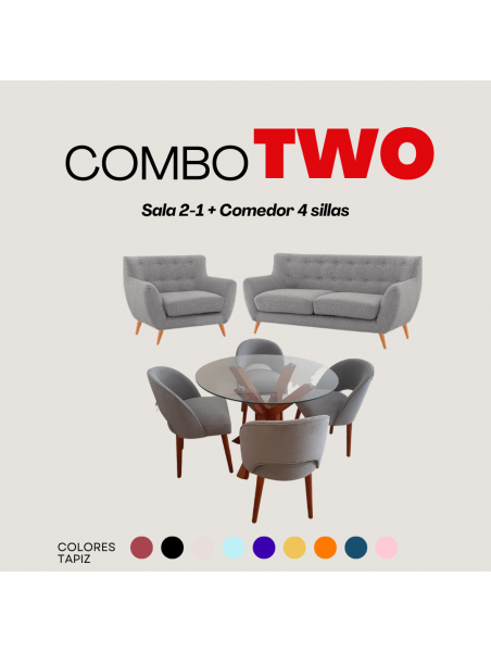 - Incluye Sofa para 2 personas + sofa para 1 persona + comedor de 4 sillas circular + 4 sillas