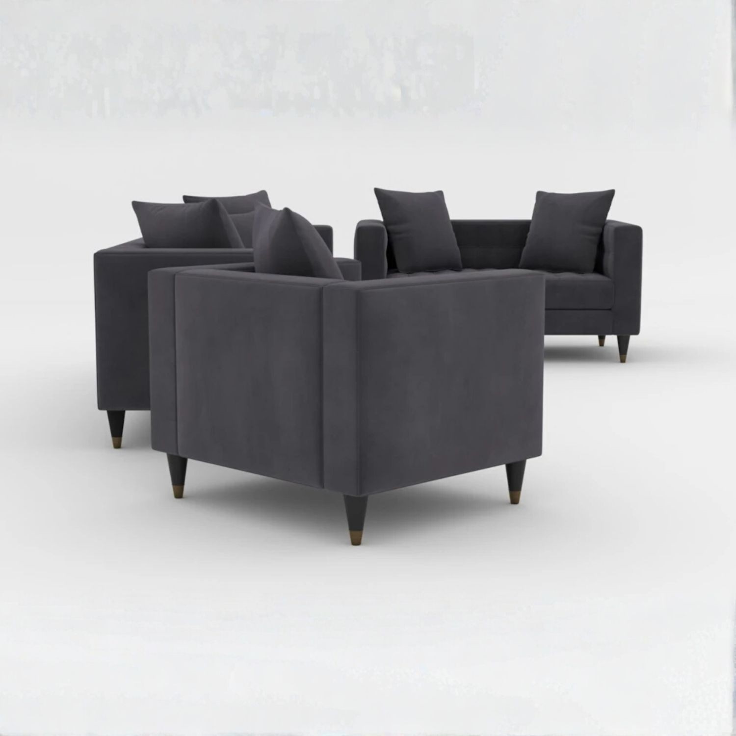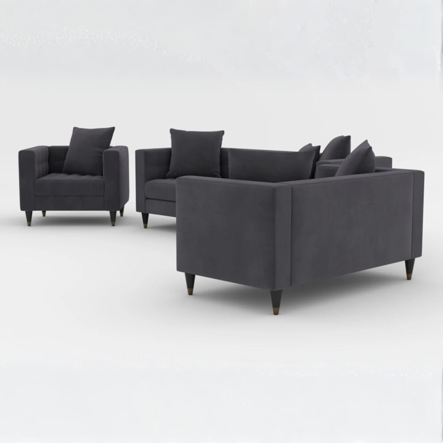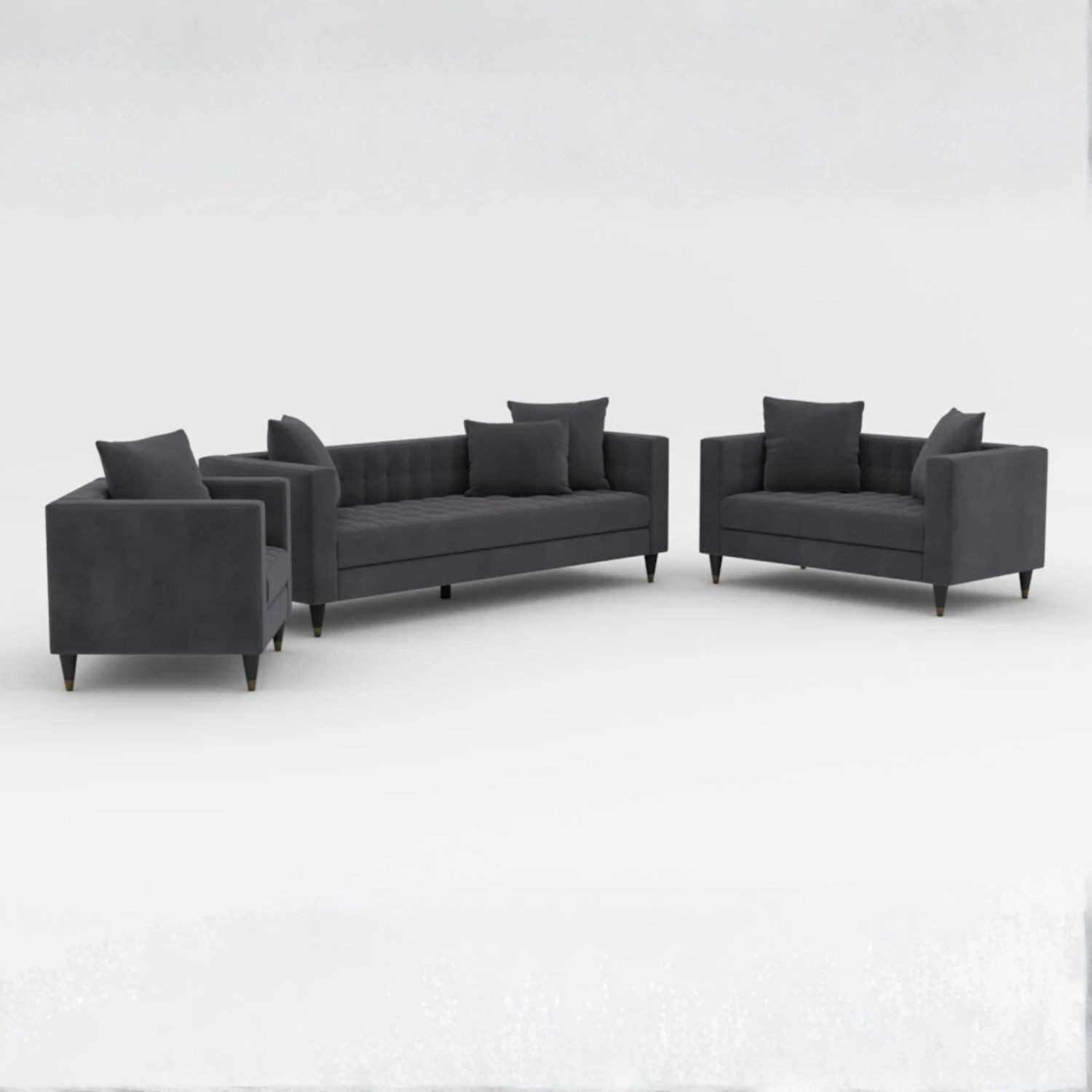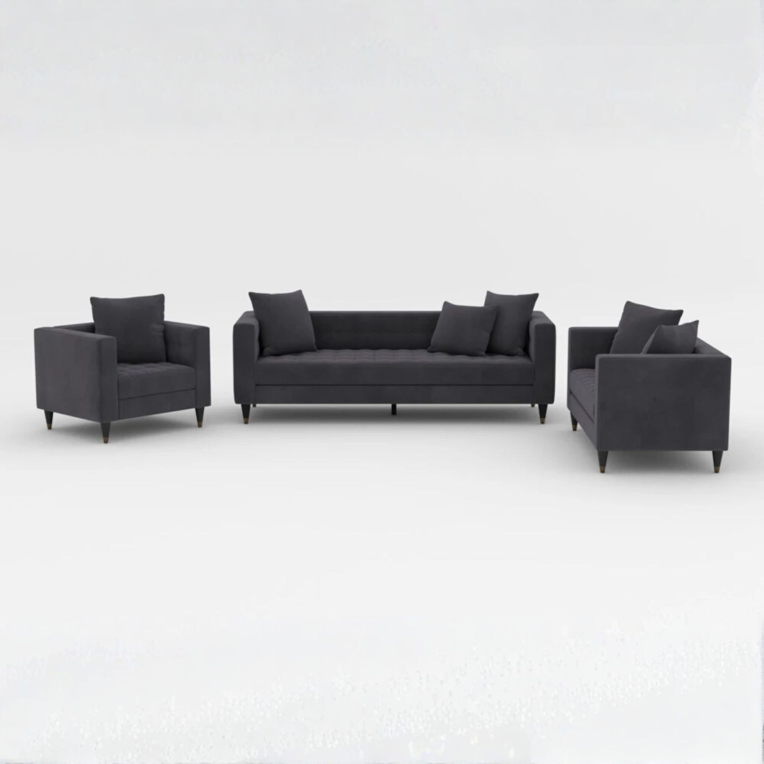 Su estructura está fabricada con madera tornillo seca al horno, garantizando firmeza y larga vida útil. Cada pieza del set —sofá de 3 plazas, 2 plazas y 1 plaza— cuenta con espuma de alta densidad que brinda soporte y comodidad superior. Las patas de madera maciza añaden un toque natural y sofisticado, elevando el estilo de cualquier ambiente.