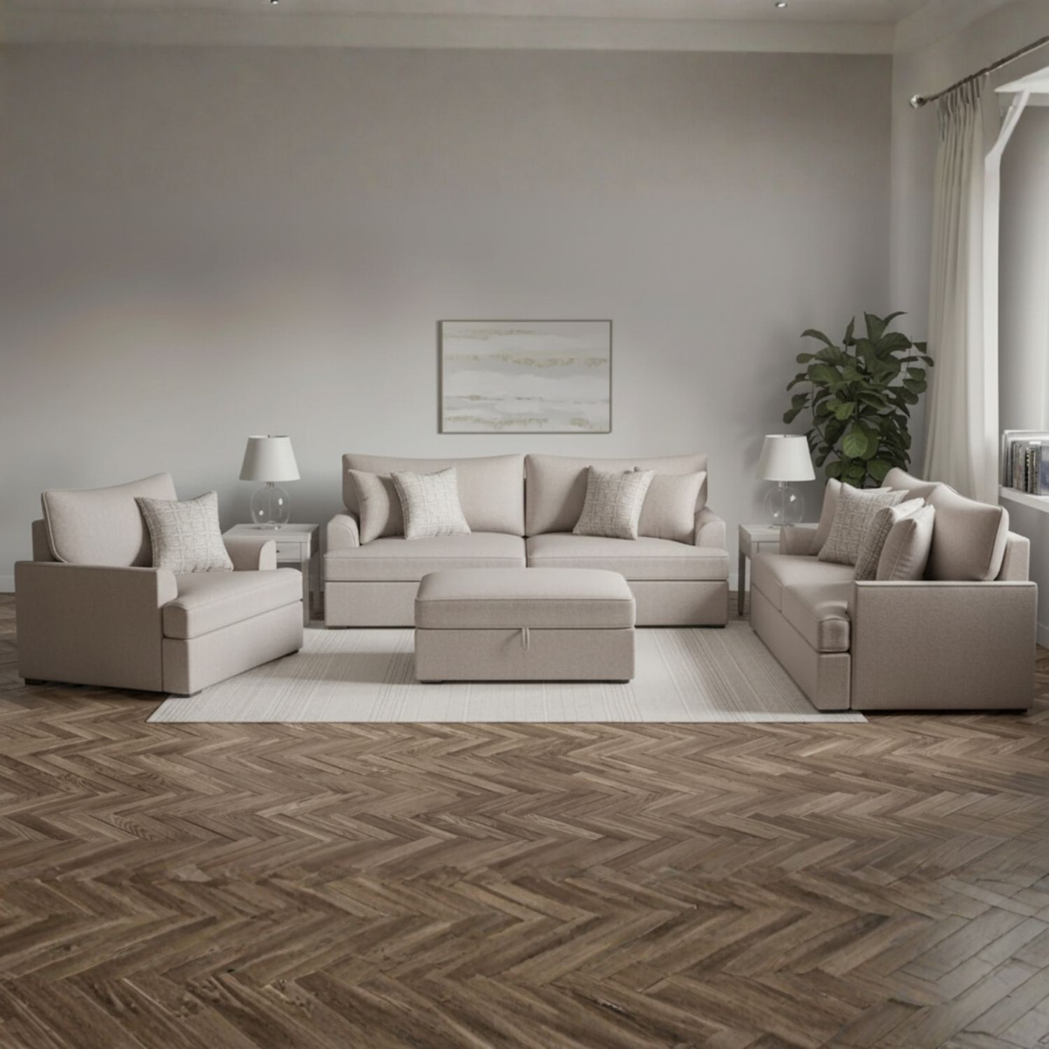 Tapizado en tela chenille antifluido, este conjunto resiste manchas y líquidos, ideal para el uso diario. La estructura de madera tornillo seca y tratada garantiza soporte y estabilidad, mientras la espuma Zebra Paraiso de 5 pulgadas (densidad 25 kg/m³) brinda firmeza y confort prolongado.
