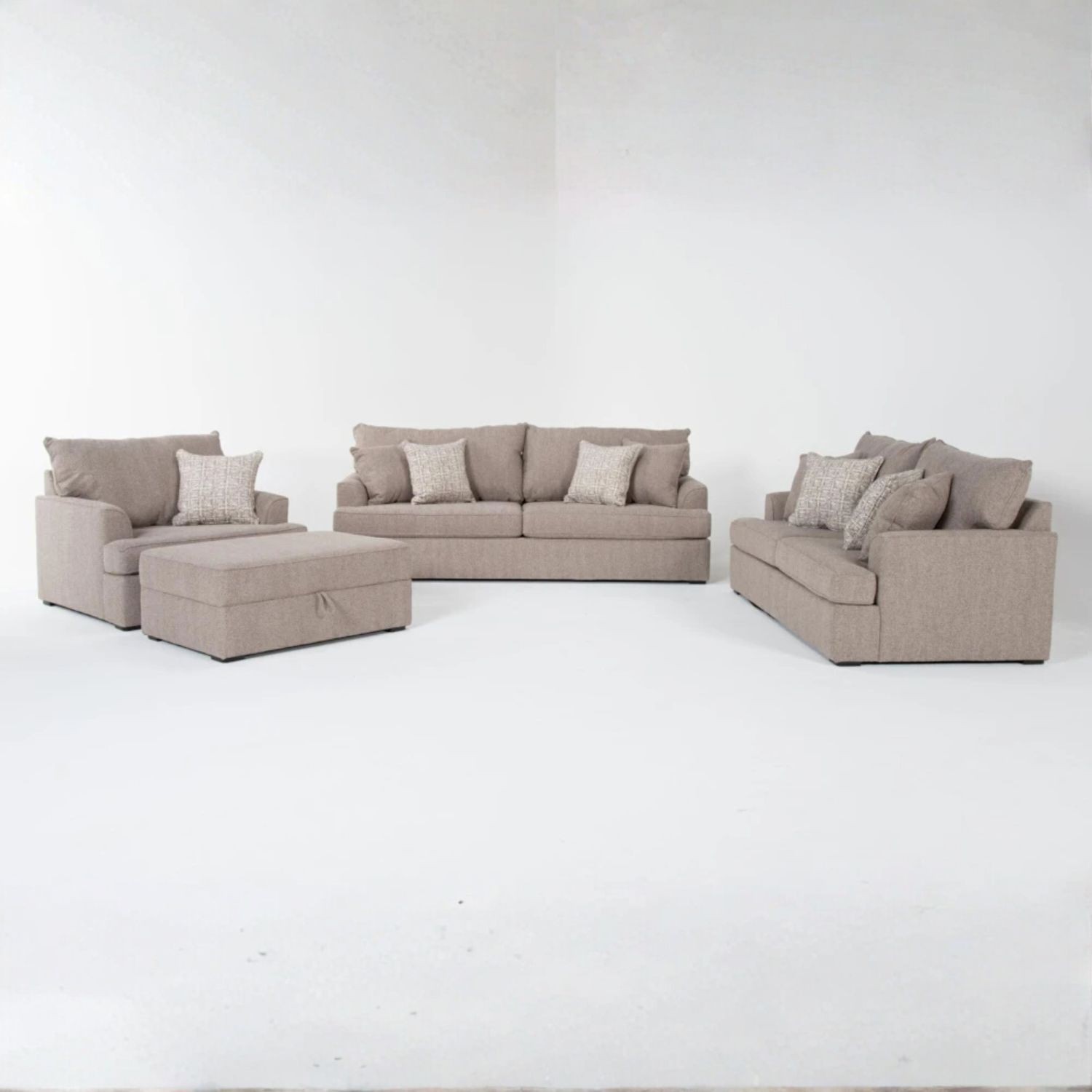 Incluye una banqueta adicional versátil y 6 cojines decorativos del mismo tono, aportando uniformidad estética y funcionalidad.