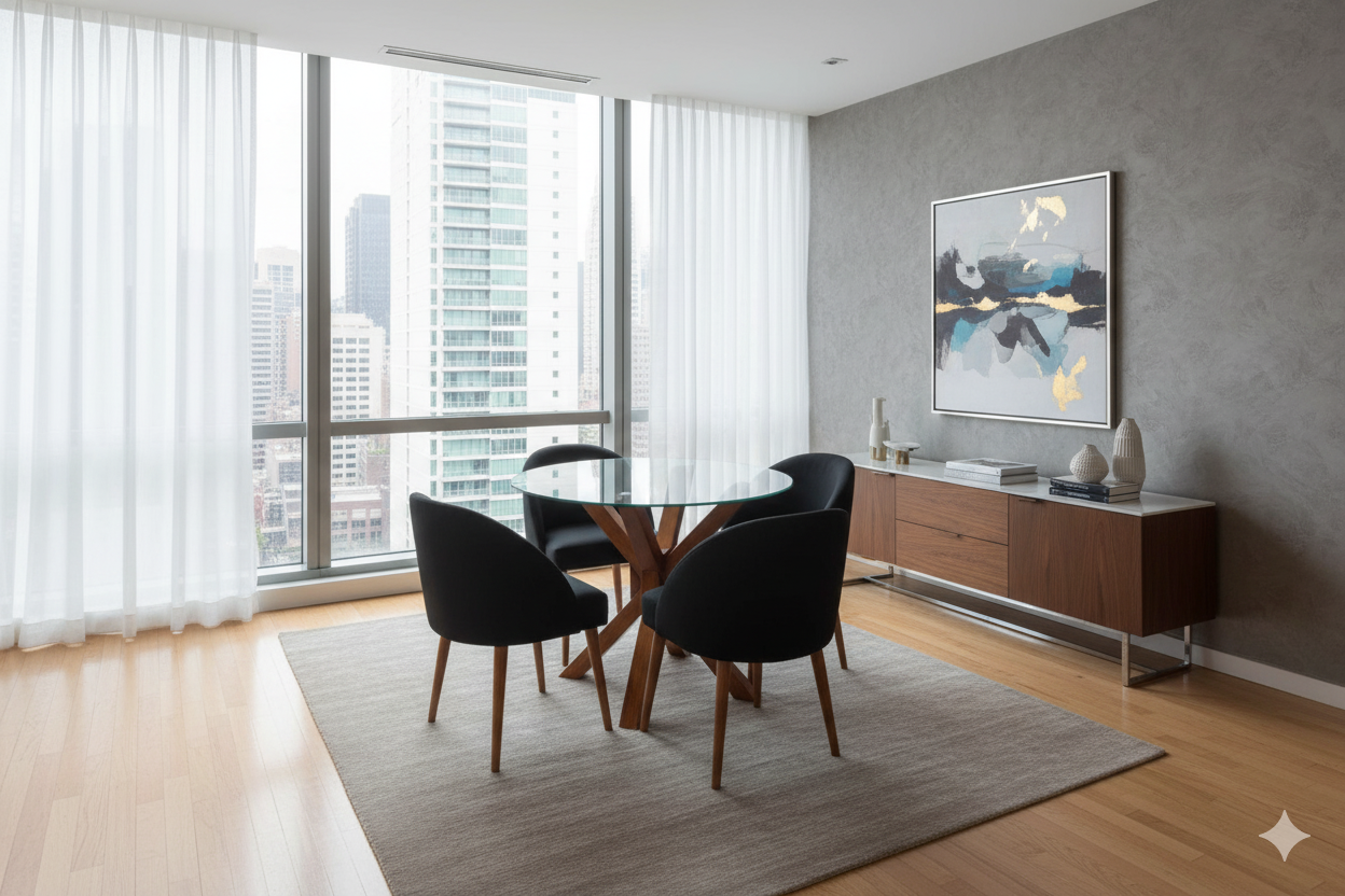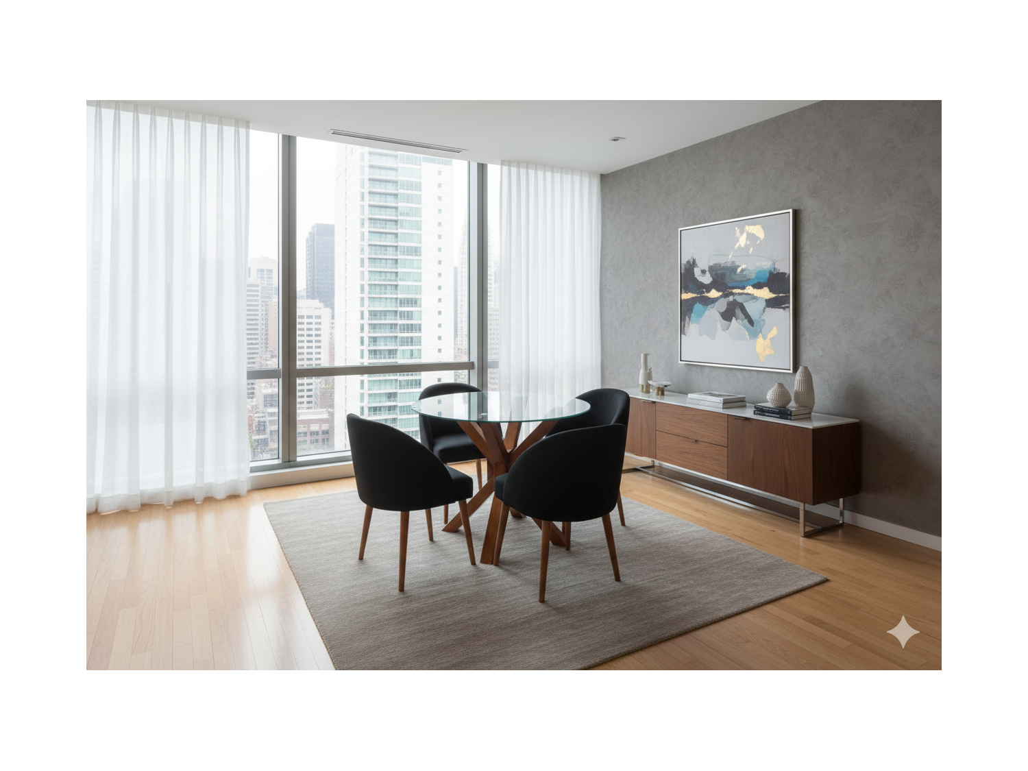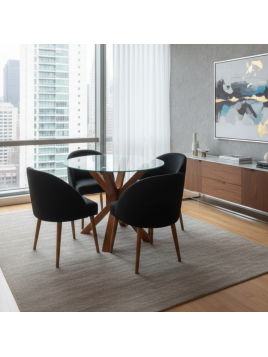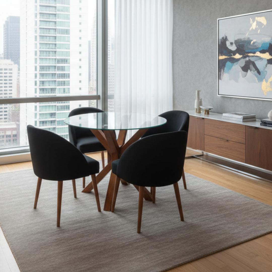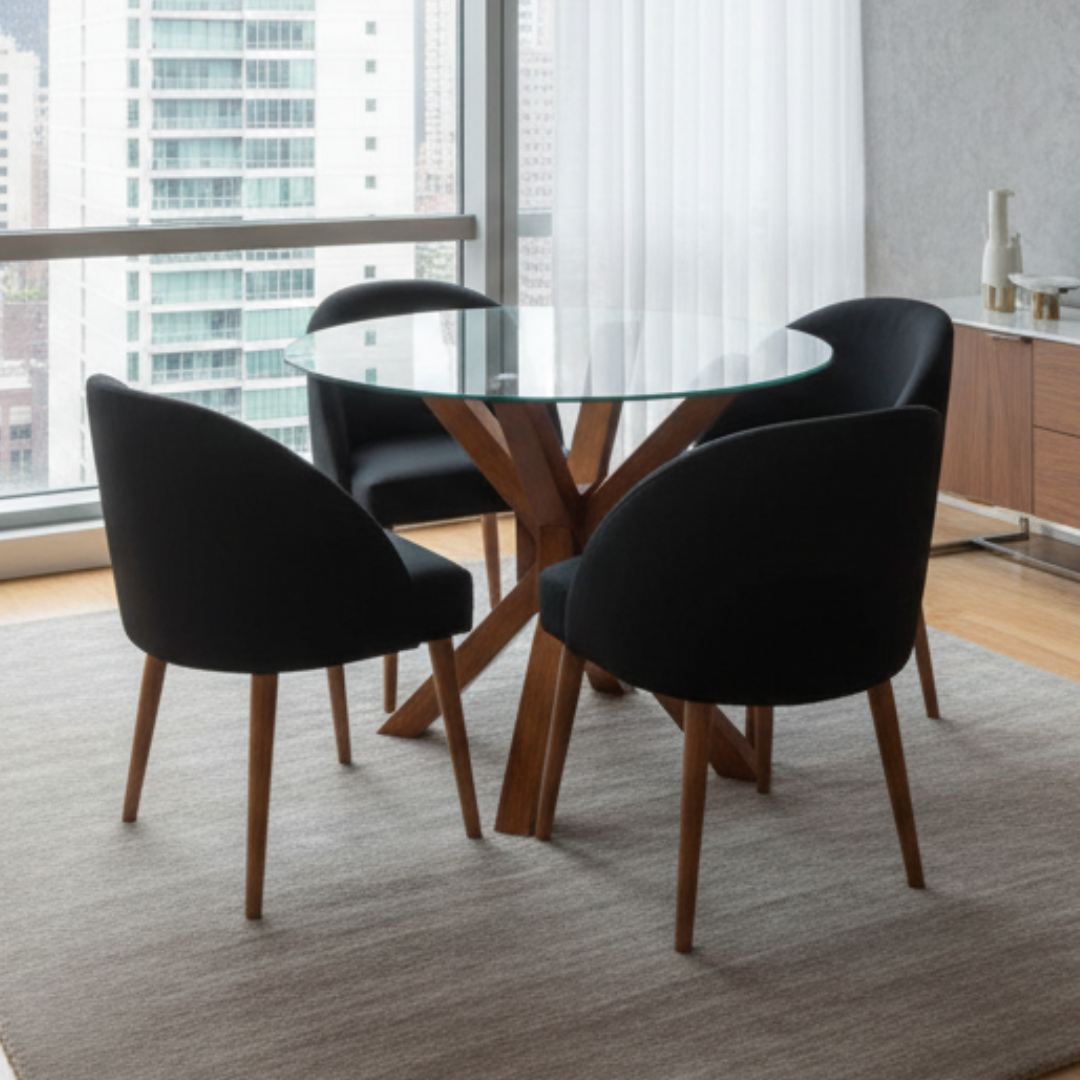 Ideal para departamentos, casas y espacios pequeños, su tablero de vidrio templado de alta resistencia y sus 4 sillas tapizadas en tela tipo Montreal crean un ambiente cálido y contemporáneo.
