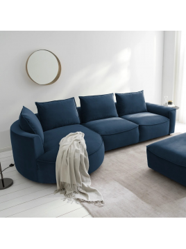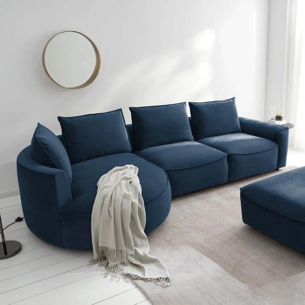 El Sofá Seccional Dessy destaca por su diseño curvo, elegante y envolvente. Tapizado en un terciopelo azul profundo, aporta un look sofisticado y contemporáneo a cualquier sala. Su estructura modular permite intercambiar los lados según tu espacio, adaptándose perfectamente a tu hogar.