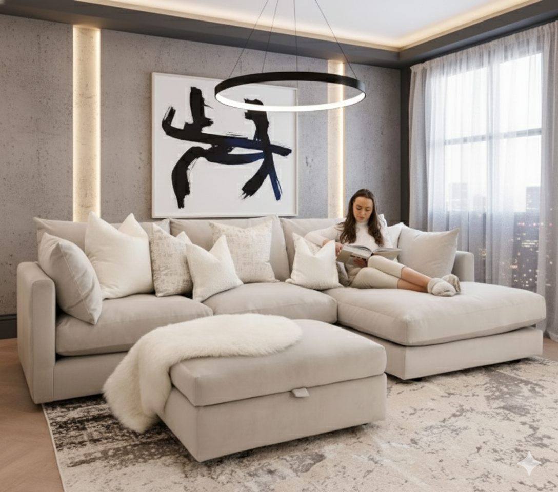 El Seccional Kristi con banqueta y 6 cojines de LMUEBLE es la solución perfecta para quienes buscan un sofá en L espacioso, moderno y fácil de mantener. Tapizado en tela chenille antifluido, este modelo es ideal para hogares con niños o mascotas, gracias a su resistencia a manchas y derrames.